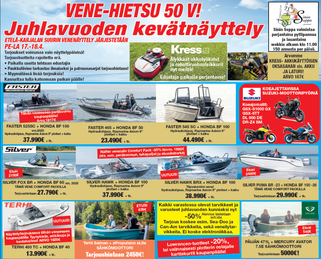 VENE-HIETSU JÄRJESTÄÄ 50V. JUHLAVUODEN KUNNIAKSI ETELÄ-KARJALAN SUURIMMAN VENE- JA KONE NÄYTTELYN PE-LA 17.-18.4.