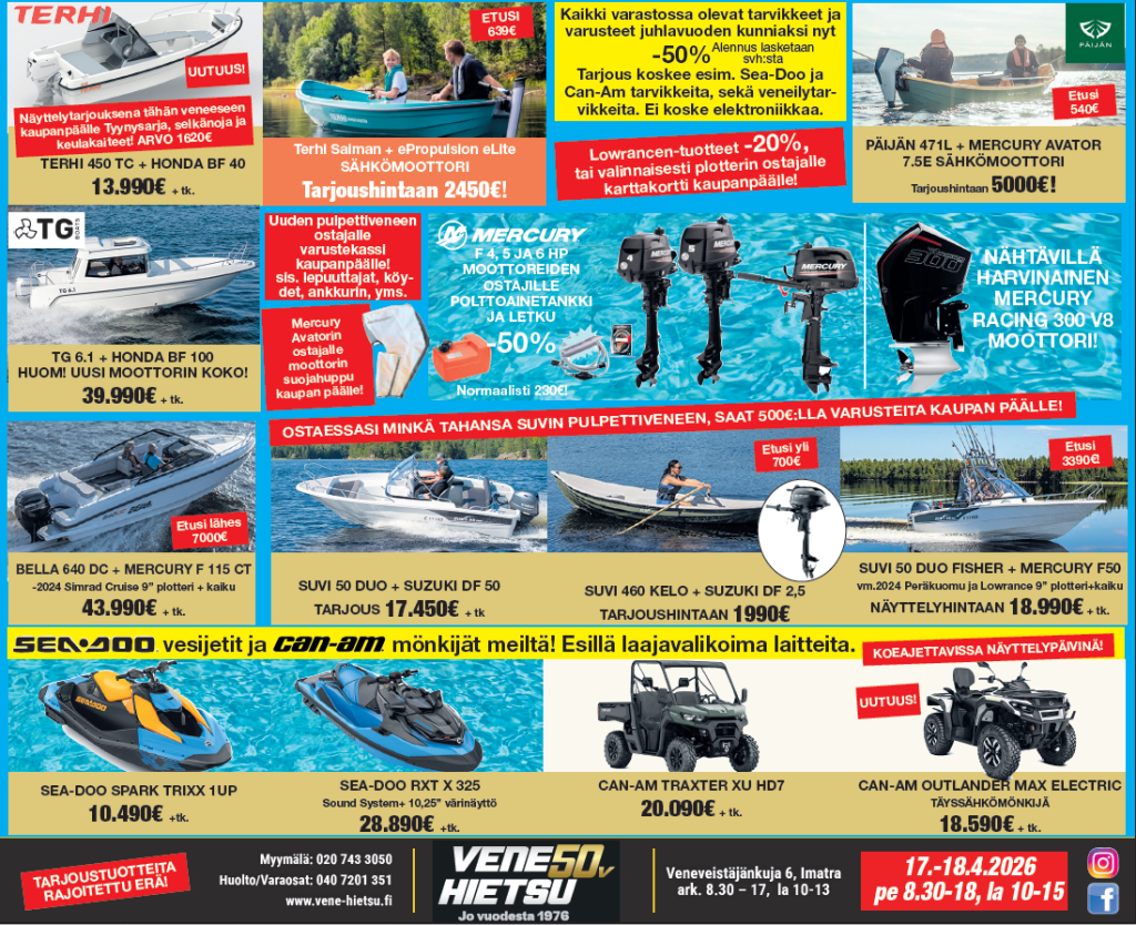 • Tarjouksia kaikista tuoteryhmistä! Esimerkiksi kaikki varastossa olevat tarvikkeet ja lisävarusteet -50% (ei koske elektroniikkaa). Lowrance tuotteet -20%, tai vaihtoehtoisesti plotterin ostajalle karttakortti kaupanpäälle.